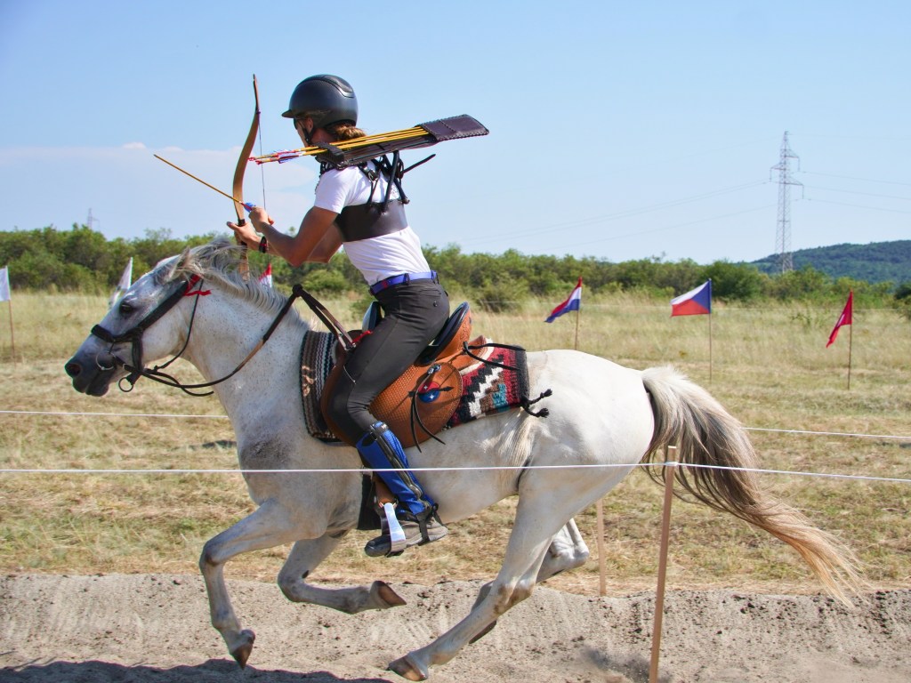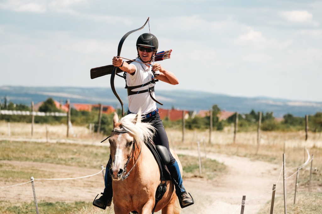 I shoot with the Slavic technique, using a quiver built by Mihai Cozmei. In the past I used thumb and three finger (mediterranean technique) so I can teach this techniques too. Here you see me riding Batukán during the EC in Hungary 2024.